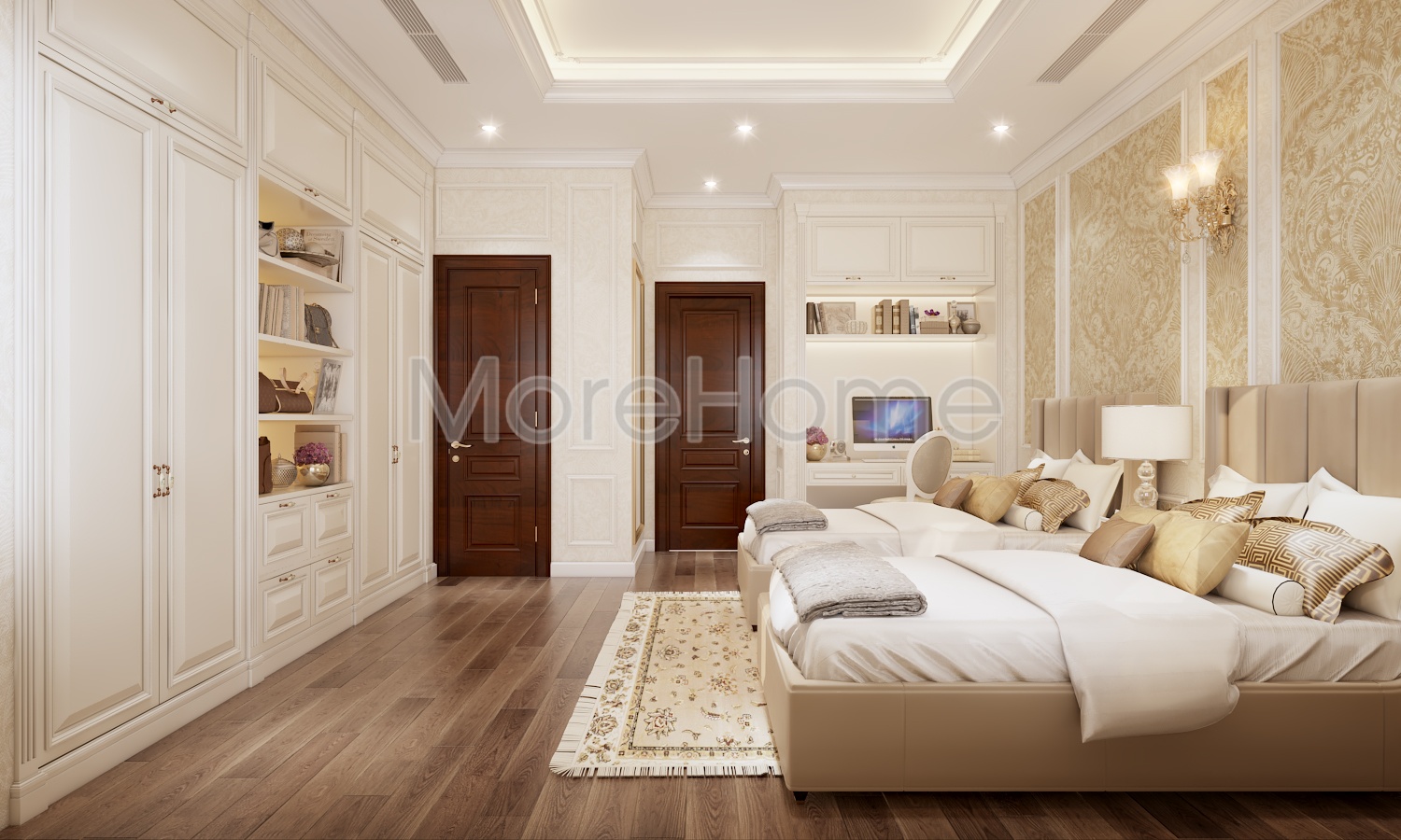 Kiến trúc sư Morehome thiết kế nội thất phòng ngủ biệt thự với đầy đủ công năng sử dụng mang lại cho gia chủ một không gian nghỉ ngơi tiện nghi và thoải mái nhất. Hệ thống đèn trang trí được đầu tư cầu kì, mĩ lệ đặc biệt là hai chiếc đèn ngủ đầu giường với thiết kế độc đáo này sẽ mang lại ánh sáng huyền ảo, gia tăng cảm giác ấm áp cho phòng ngủ mang lại những giấc ngủ ngon và sâu hơn cho gia chủ.