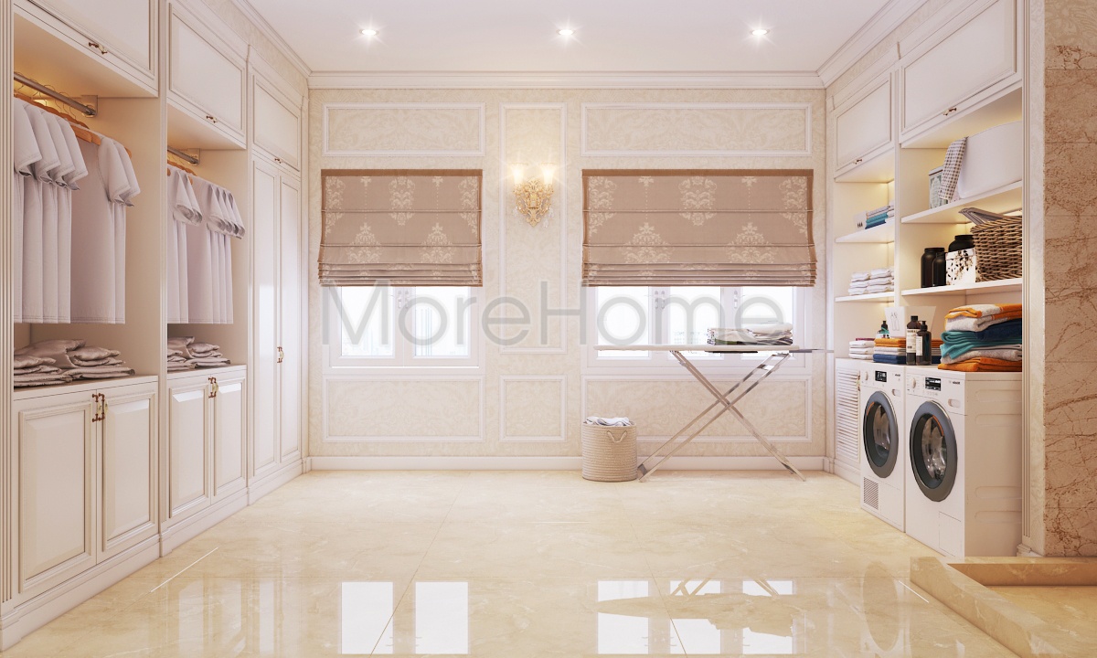 Tầng áp mái của biệt thự được kiến trúc sư Morehome thiết kế tận dụng àm không gian giặt đồ, là đồ cho gia chủ. Thiết kế hệ thống tủ kịch trần tạo ra nhiều không gian lưu trữ vừa mang yếu tố thẩm mĩ cao vừa mang lại sự gọn gàng, ngăn nắp cho không gian này.