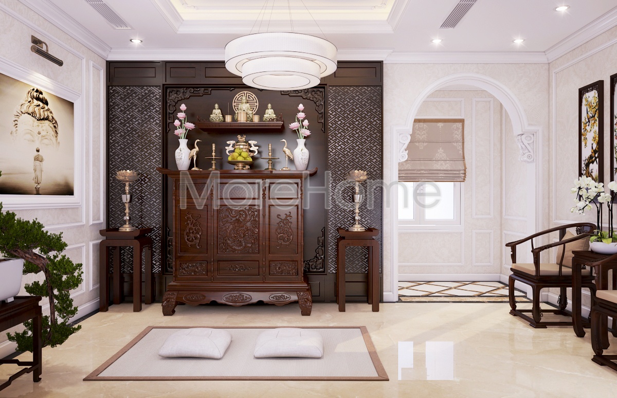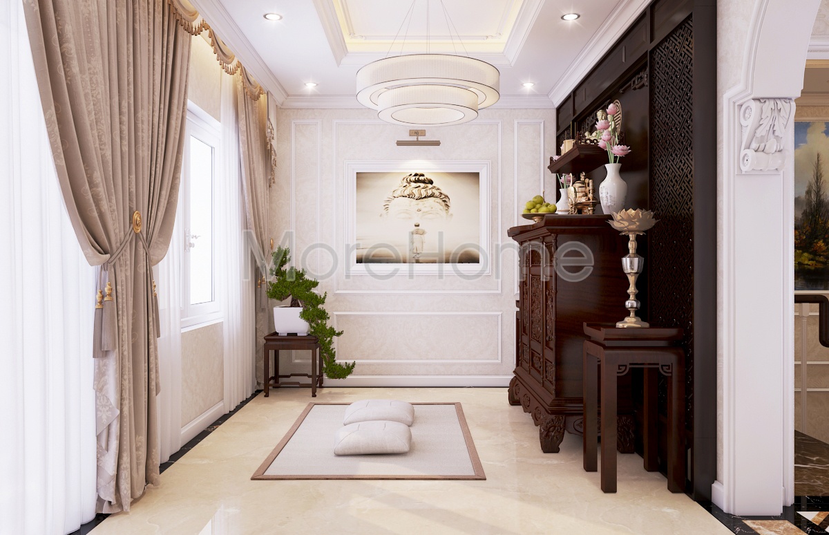 Thiết kế nội thất phòng thờ : Không gian phòng thờ được thiết kế nằm ở khu vực cao và thoáng nhất của ngôi biệt thự này. Đây là một trong những yếu tố phong thủy tốt mang lại may mắn cho gia chủ. Hệ thống tủ thờ băng gỗ tự nhiên chắc chắn được đầu tư kĩ lưỡng, cầu kì, tỉ mỉ , hai chiếc đôn thờ gỗ được kê cân đối hai bên để đặt đồ trang trí mang lại sự tôn nghiêm, thể hiện tâm ý của gia chủ với gia tiên.