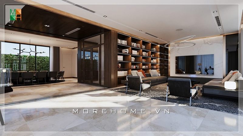 Mẫu thiết kế phòng khách biệt thự, nhà phố với nội thất gỗ óc chó cao cấp đầy sang trọng, thoáng đãng của không gian rộng lớn hiện đại.