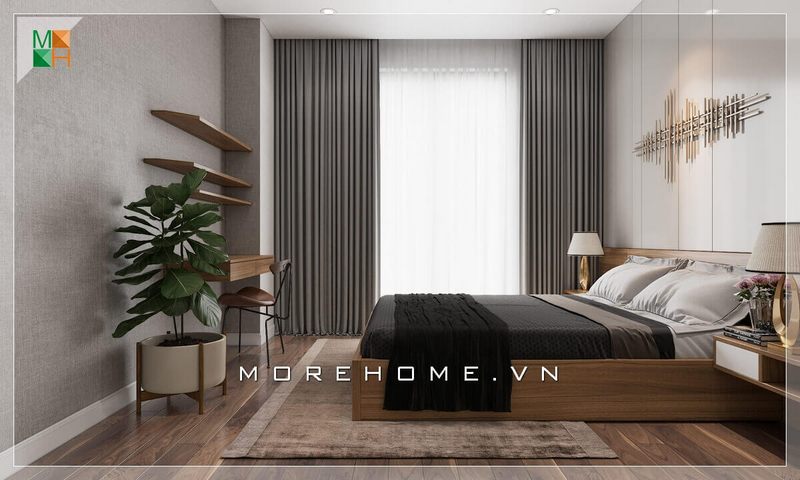 Thiết kế phòng ngủ có kệ trang trí bắt tường phù hợp với không gian căn phòng ngủ, biến căn phòng ngủ trở nên tiện ích và sang trọng hơn rất nhiều.
