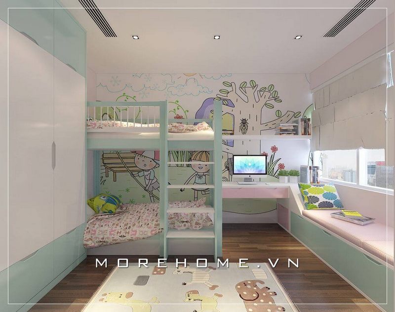 Nội thất phòng ngủ trẻ em hiện đại, giường ngủ gỗ công nghiệp với sự kết hợp hài hòa màu sắc tạo điểm nhấn nổi bật cho cả không gian