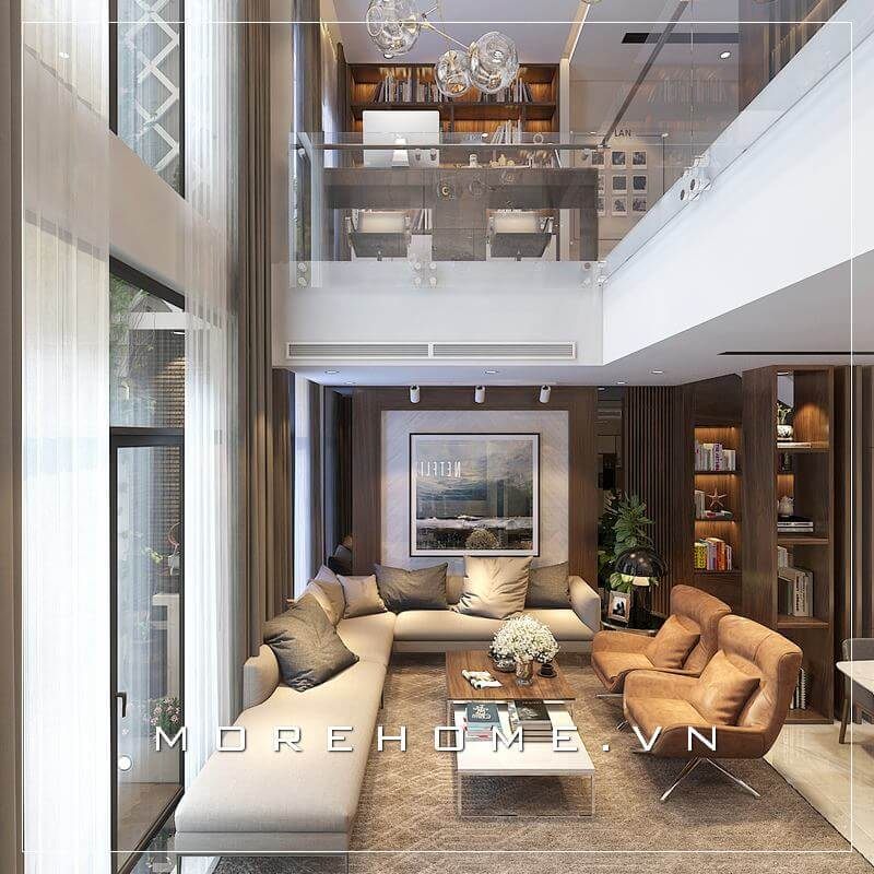 Mẫu thiết kế nội thất biệt thự hiện đại với bộ sofa chữ L bọc nỉ cao cấp tỉ lệ chuẩn với kích thước không gian căn phòng khách mang đến sự sang trọng, tinh tế
