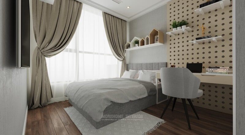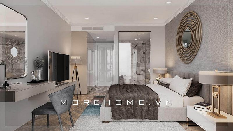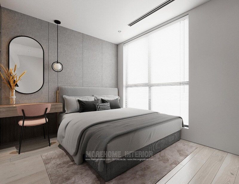 Trang trí nội thất phòng ngủ bố mẹ với mẫu giường ngủ gỗ công nghiệp bọc vải màu xám đầy quyến rũ
