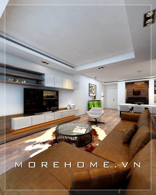 . Sự kết hợp giữa 2 tone trắng và nâu để thiết kế không gian nội thất phòng khách đã tạo ra một vẻ đẹp độc đáo và sáng tạo, đồng thời liền mạch trong từng gam màu.